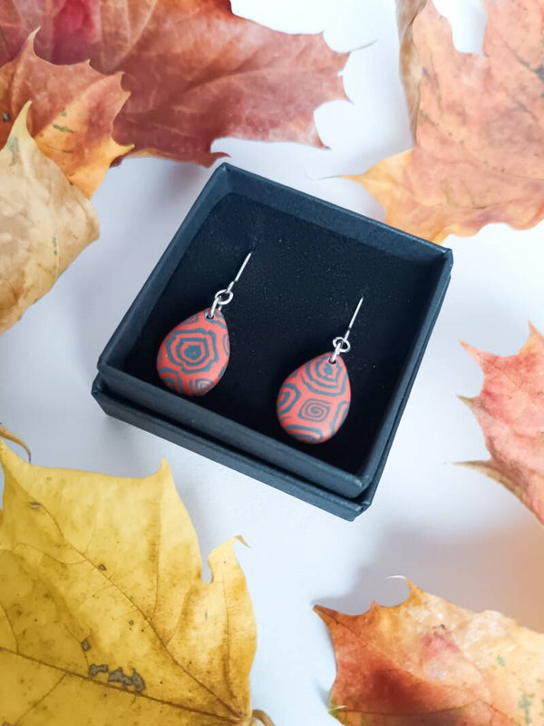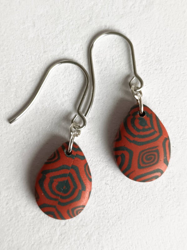Classic terracotta with grey small teardrop earrings in geometric swirl pattern finished with stainless steel hooks.