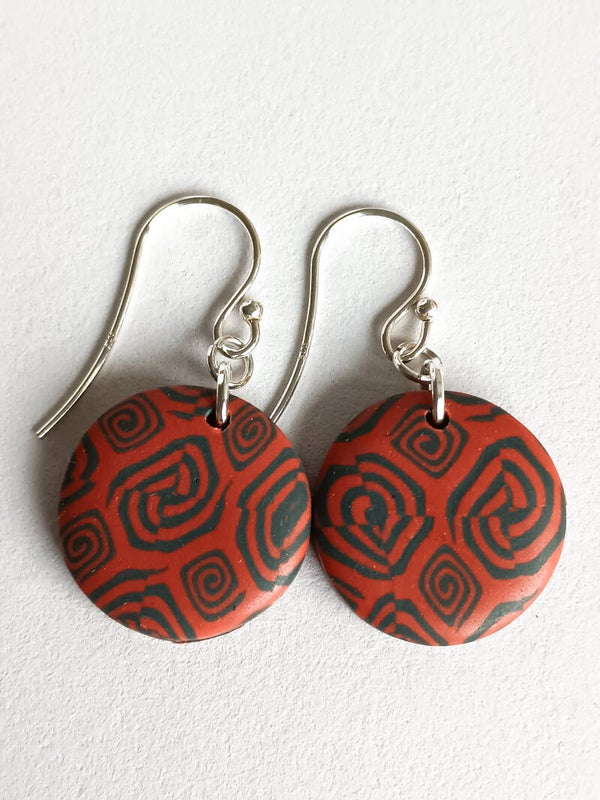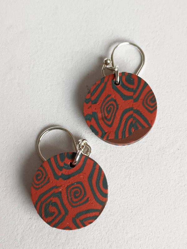Classic terracotta with grey small circle earrings in a geometric swirl pattern finished with sterling silver hooks.