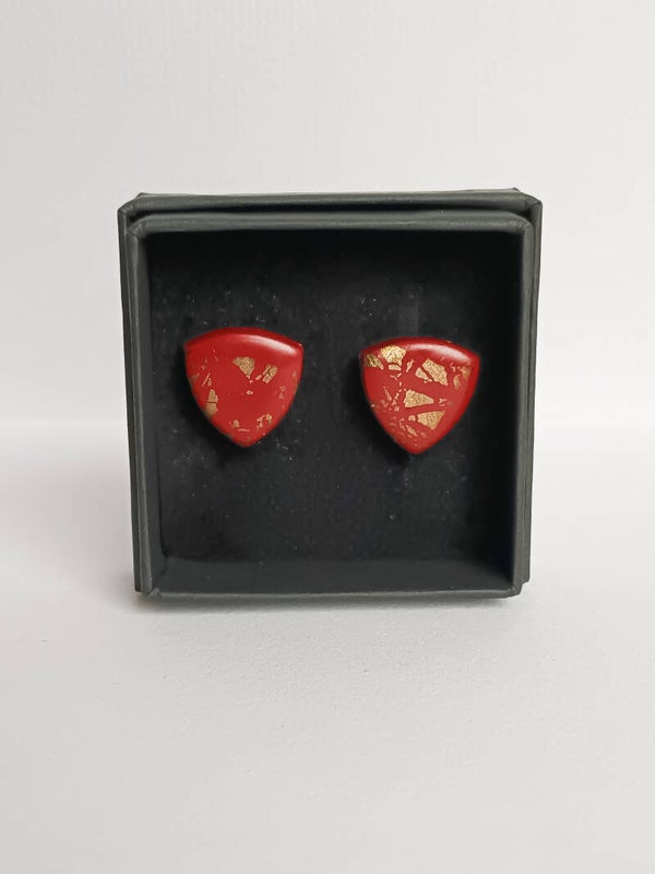 Elegant small triangle stud earrings in burgundy with gold inlay finished with embedded stainless steel hooks.