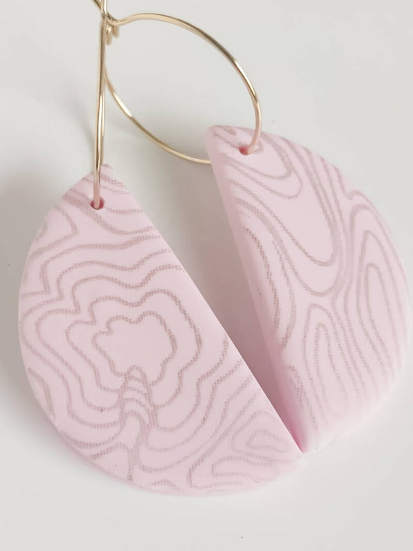 These pink half circle earrings feature terrain silkscreen print in golden hue, offering a pop of individuality to your look. Since each pair is handcrafted individually, slight variations might occur compared to the picture. More print patterns are available.