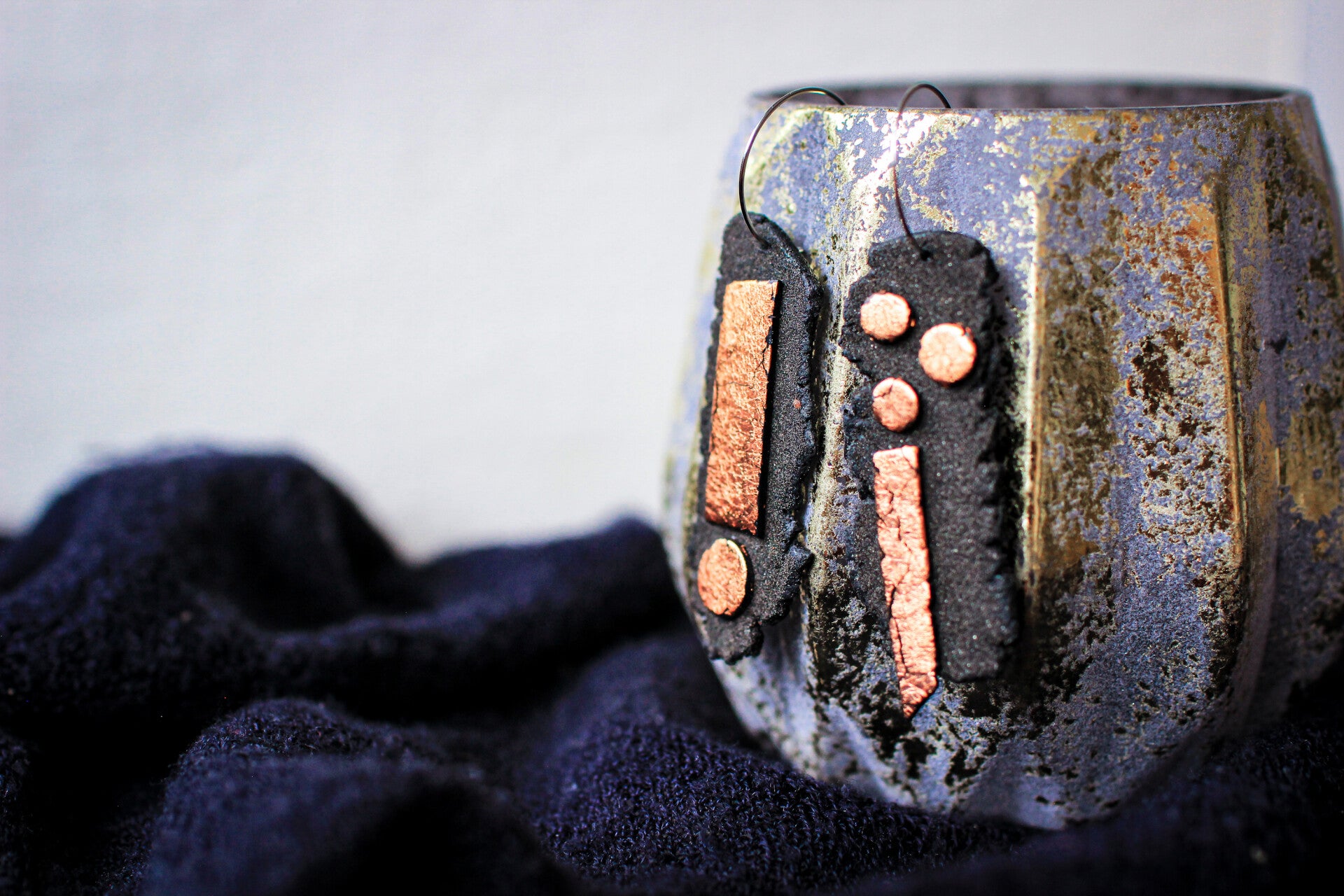 Handmade from polymer clay with embedded glass inclusions and metal sheet details. The surface is deliberately rough and textured, contrasting with metallic accents that catch the light subtly.