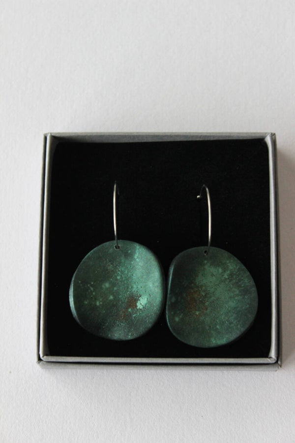 Handcrafted earrings made from polymer clay, coloured with layers of mica powders and subtly embellished with glass inclusions. The surface carries a soft metallic sheen, shifting with light while retaining a raw, weathered feel.