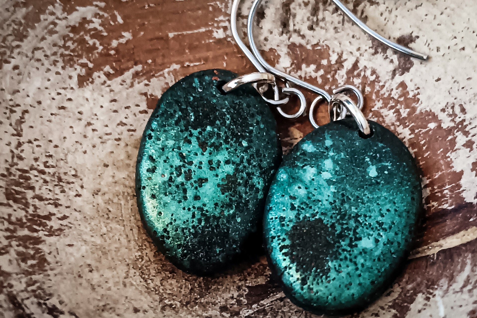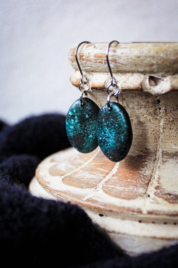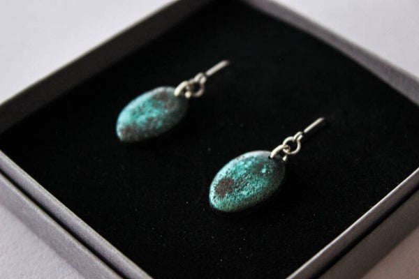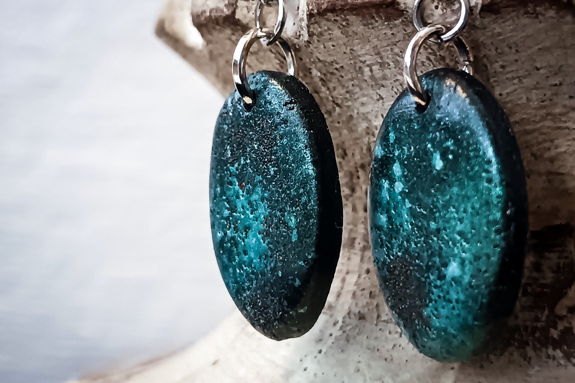Handcrafted small dangle earrings made from polymer clay, coloured with layered mica powders and finished with subtle glass inclusions. The surface has a softly weathered, metallic texture that catches light without overpowering.
