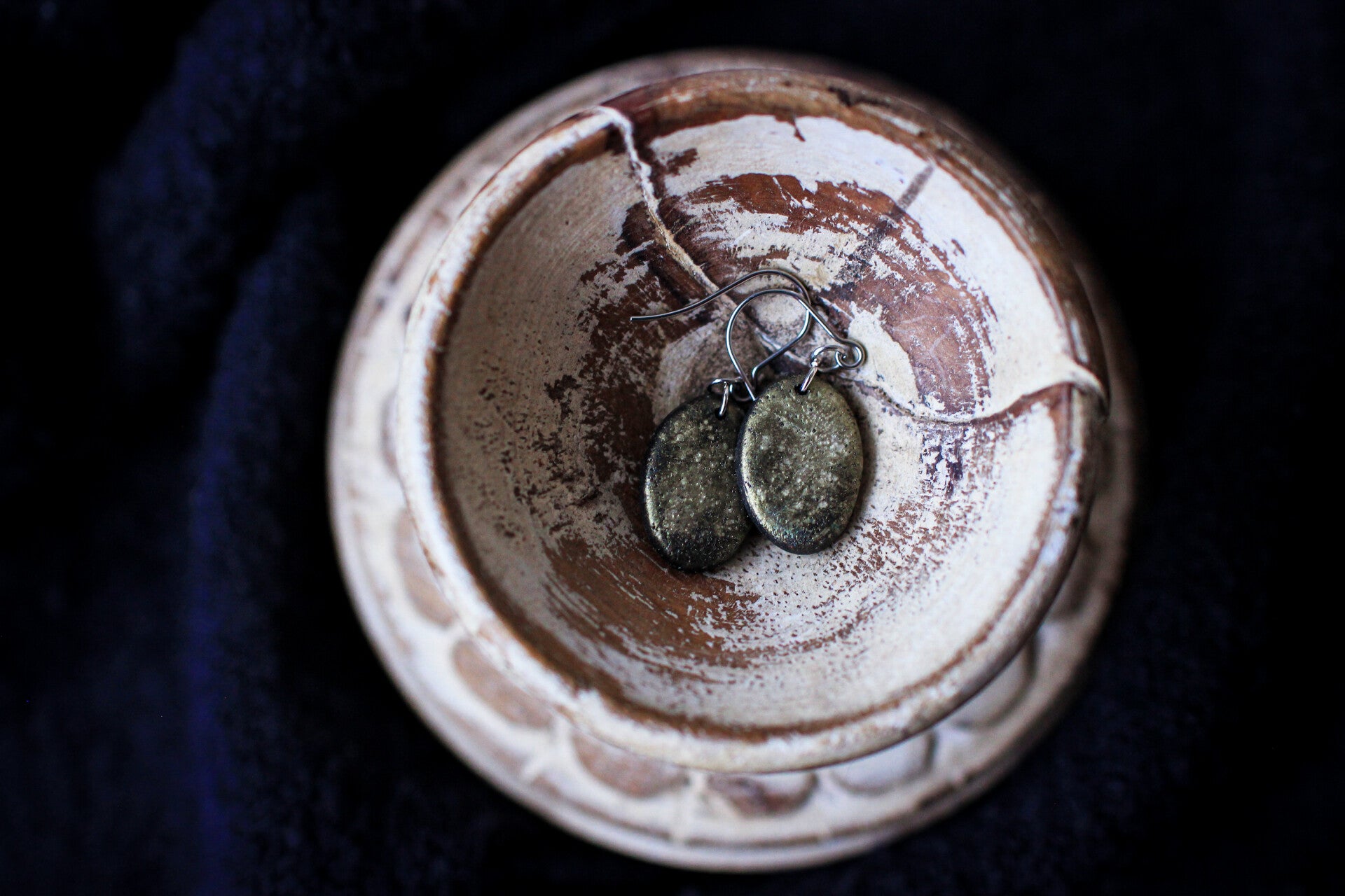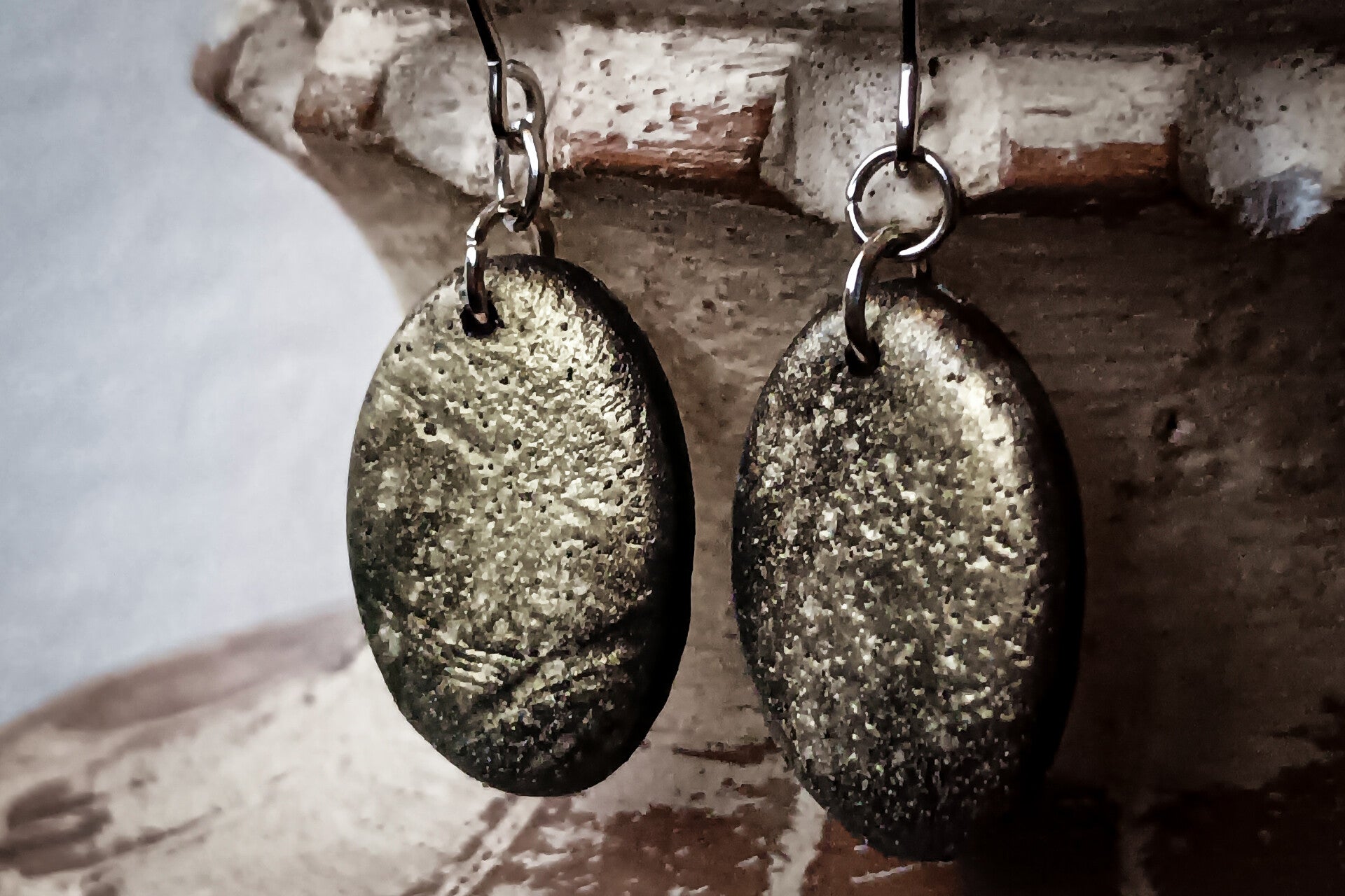 Handcrafted small dangle earrings made from polymer clay, coloured with layered mica powders and finished with subtle glass inclusions. The surface has a softly weathered antiqued gold texture that catches light without overpowering.