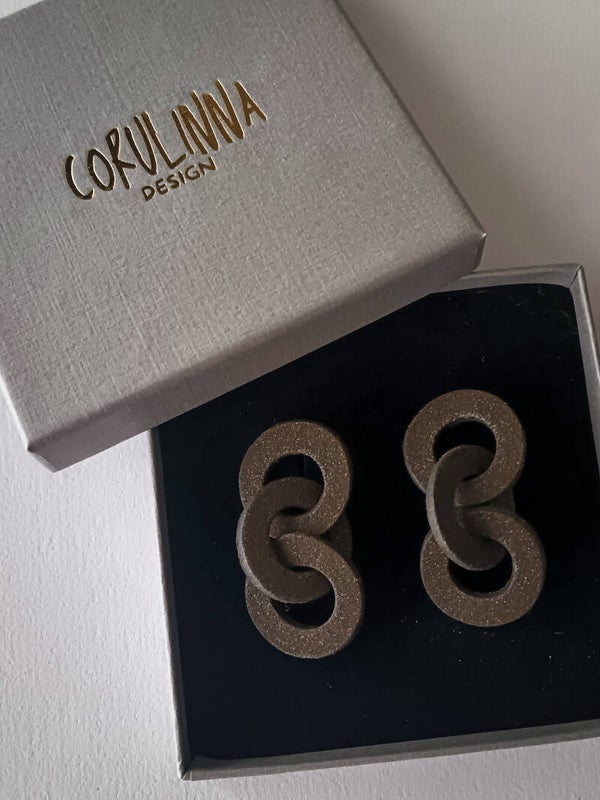 Brutalist chain-link earrings featuring three connected loops with a rusted, weathered surface. Each loop is hand-formed from polymer clay with glass inclusions, finished in deep brown and off-black tones to mimic aged metal.
