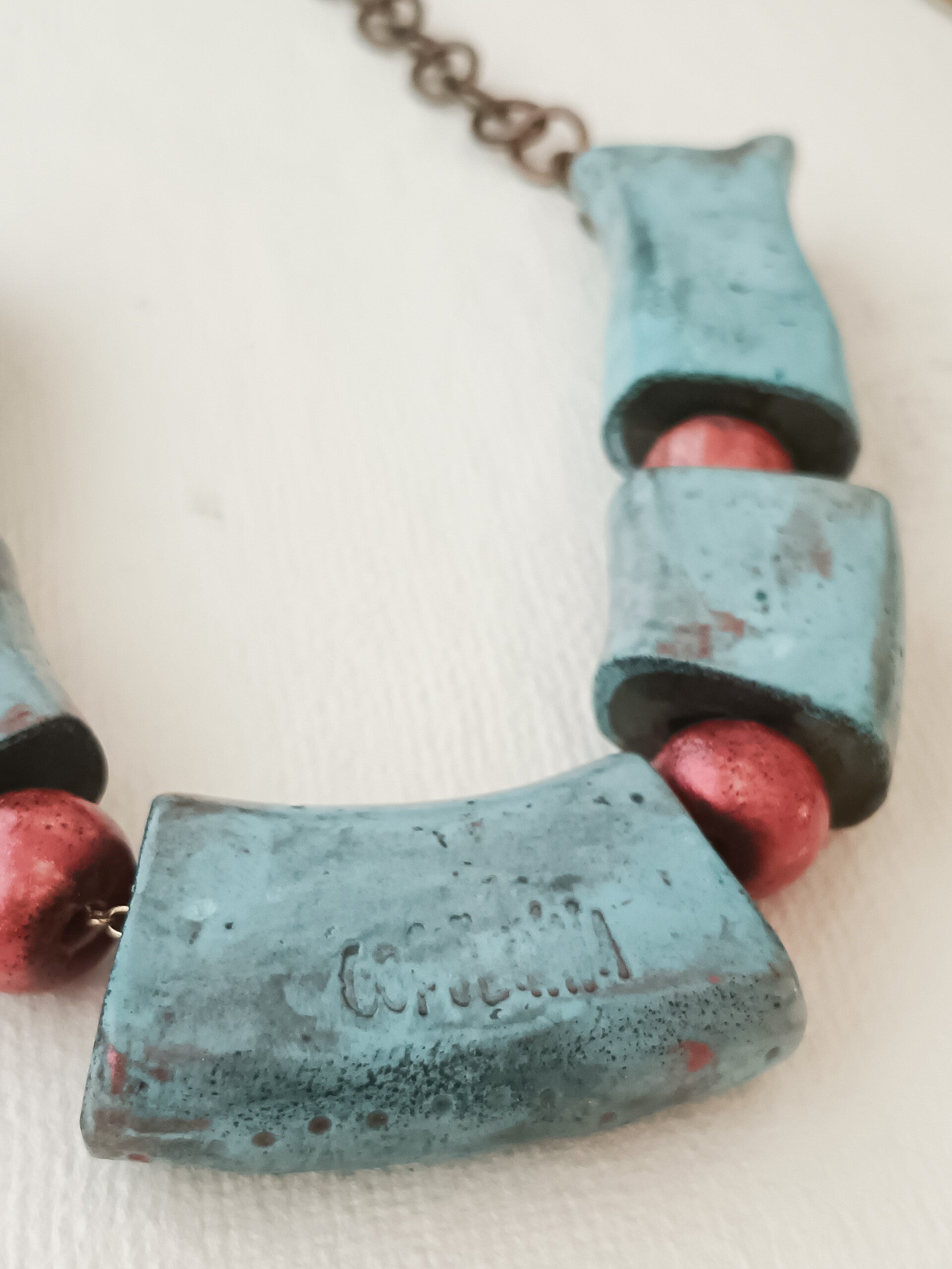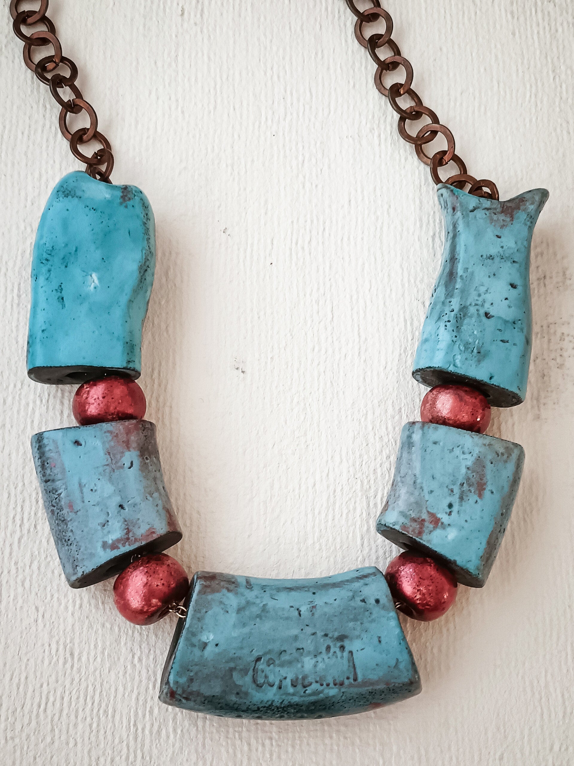 Materials: polymer clay, alcohol inks, patina, copper chain.