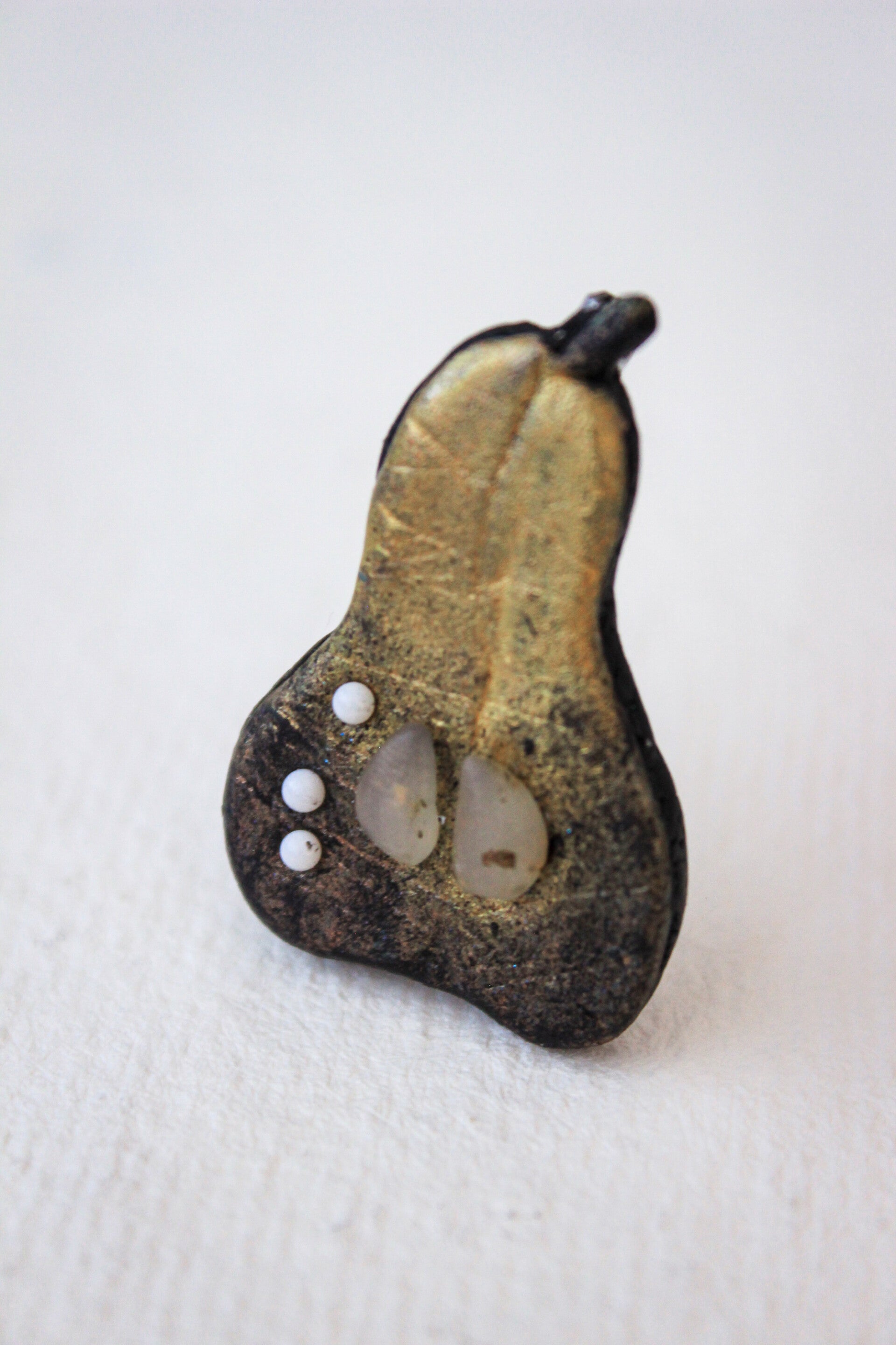 One of a kind artisan pear brooch in gold colour with dark patina and subtle distraught elements.