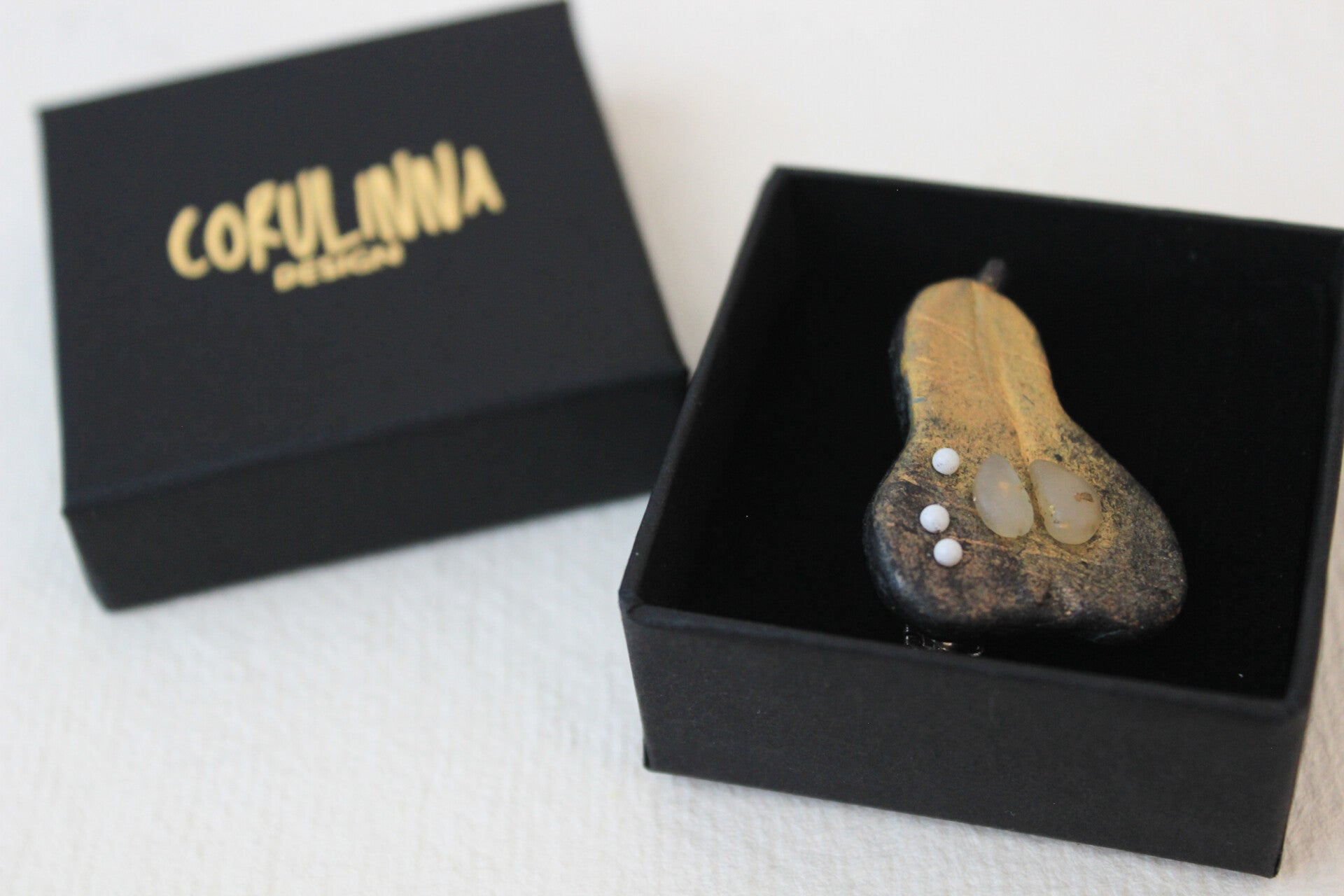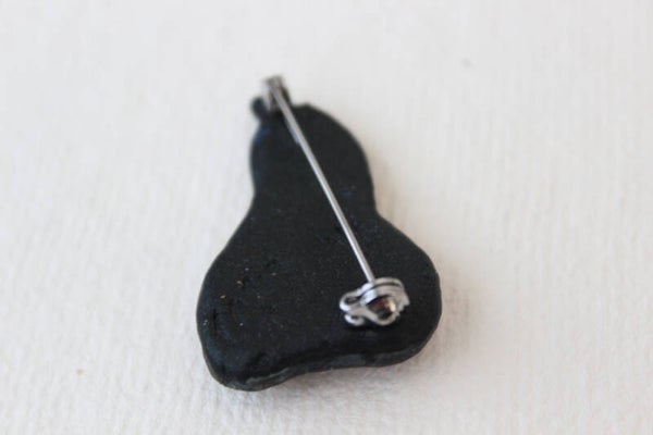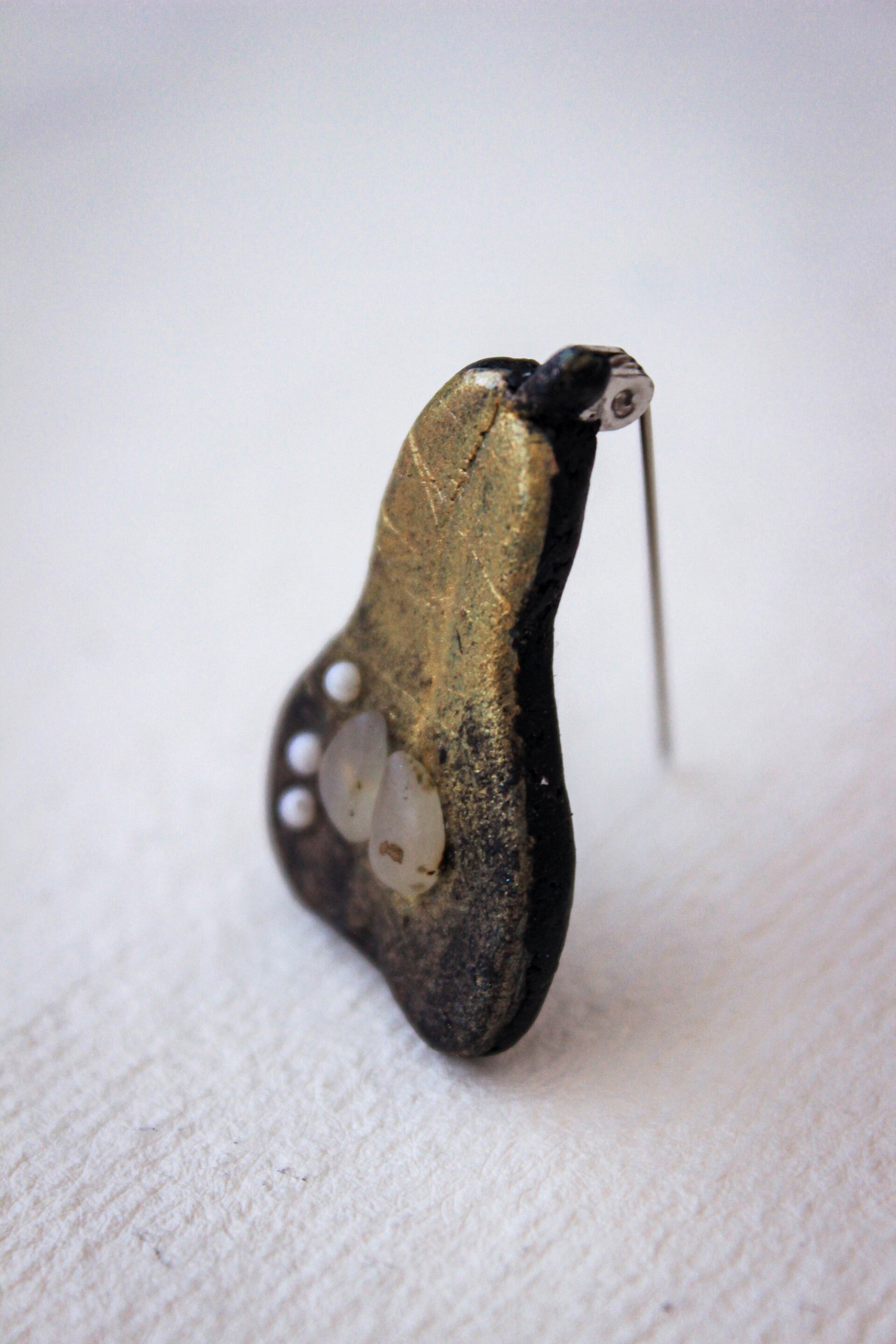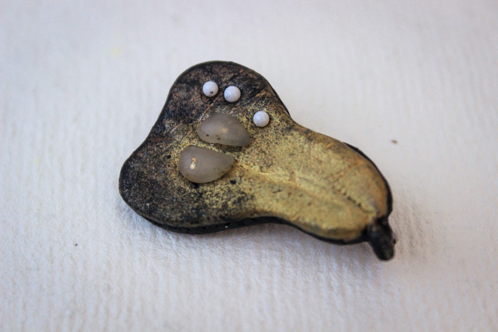 Materials: polymer clay, acrylic paint, patina, plastic beads and stainless steel brooch pin.