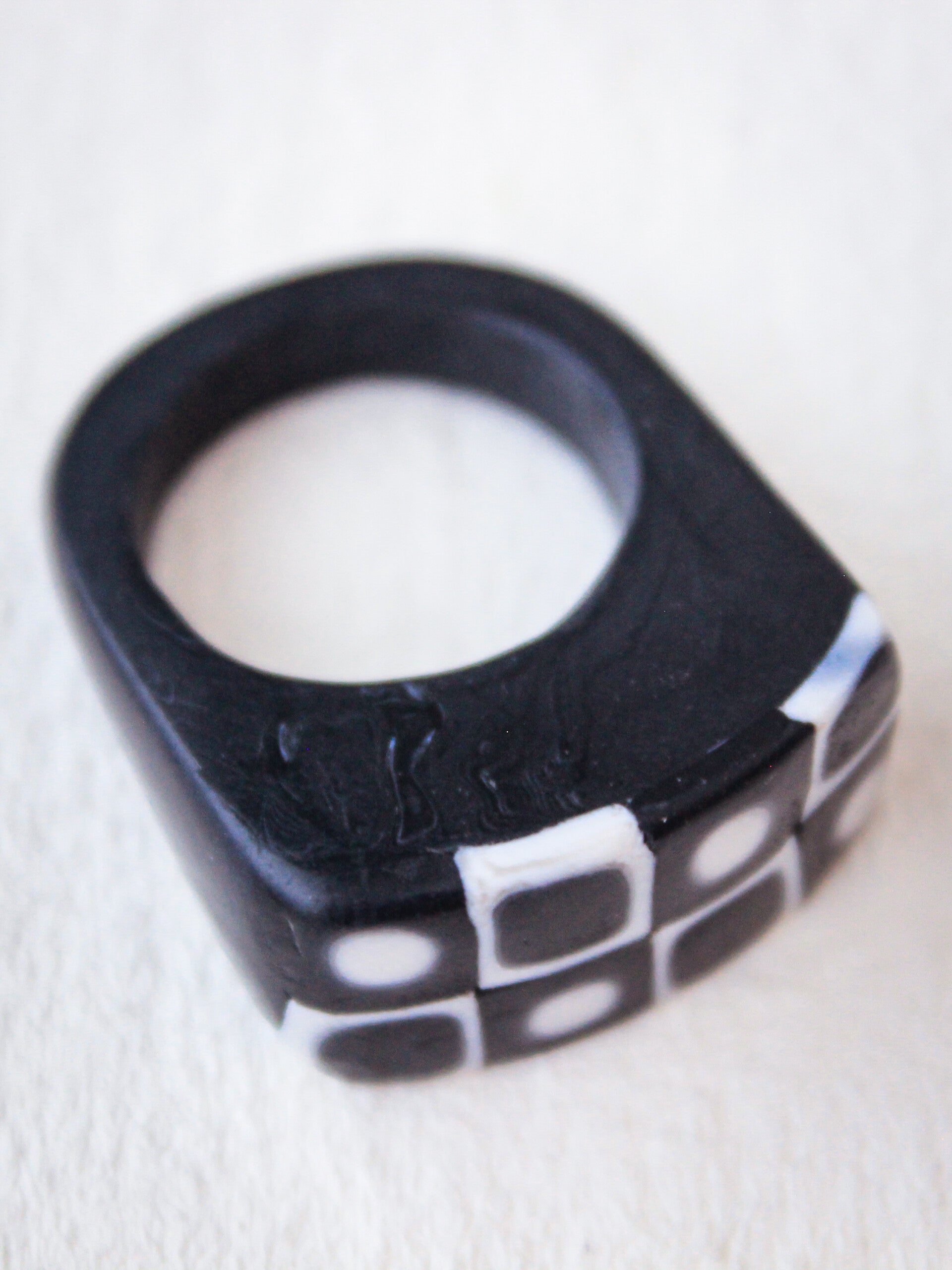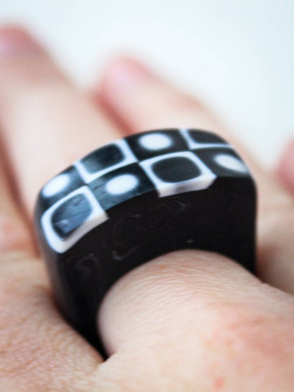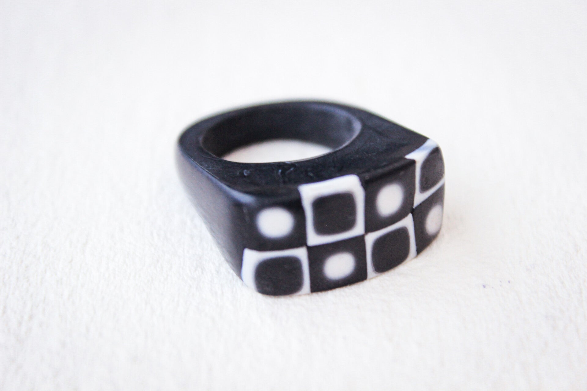 One-of-a-kind hand-carved ring in solid polymer clay.Graphic inlay, sculptural form, finished by hand.