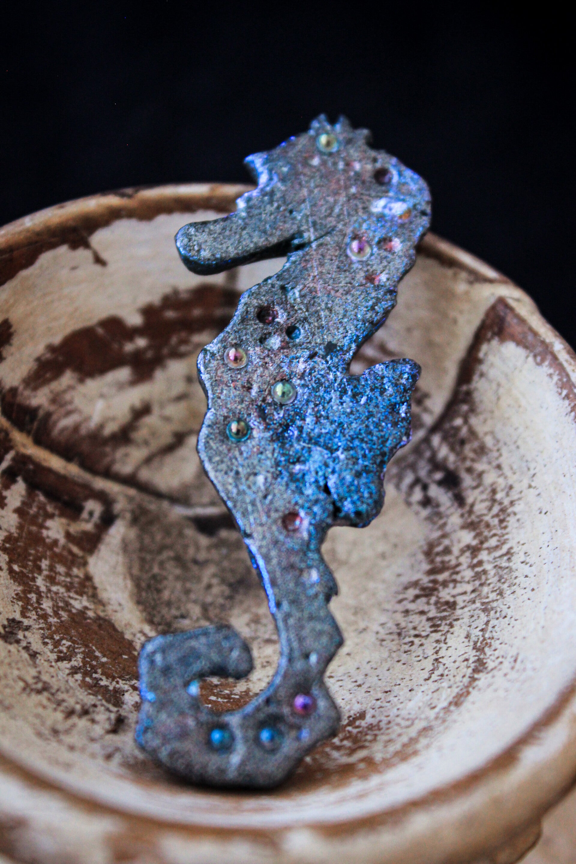 One of a kind artisan seahorse brooch with distraught textured surface in greyish petrol blue colour.