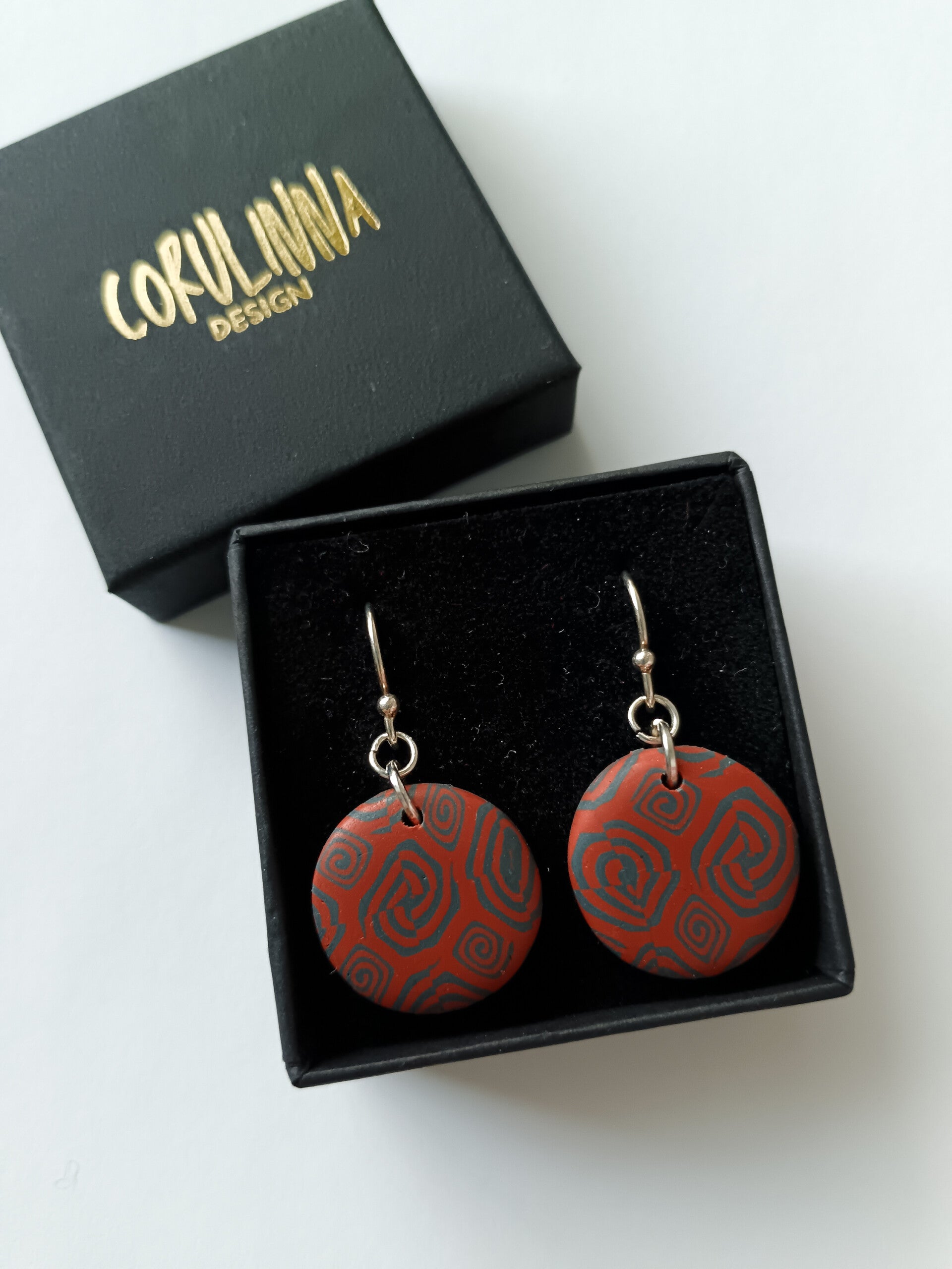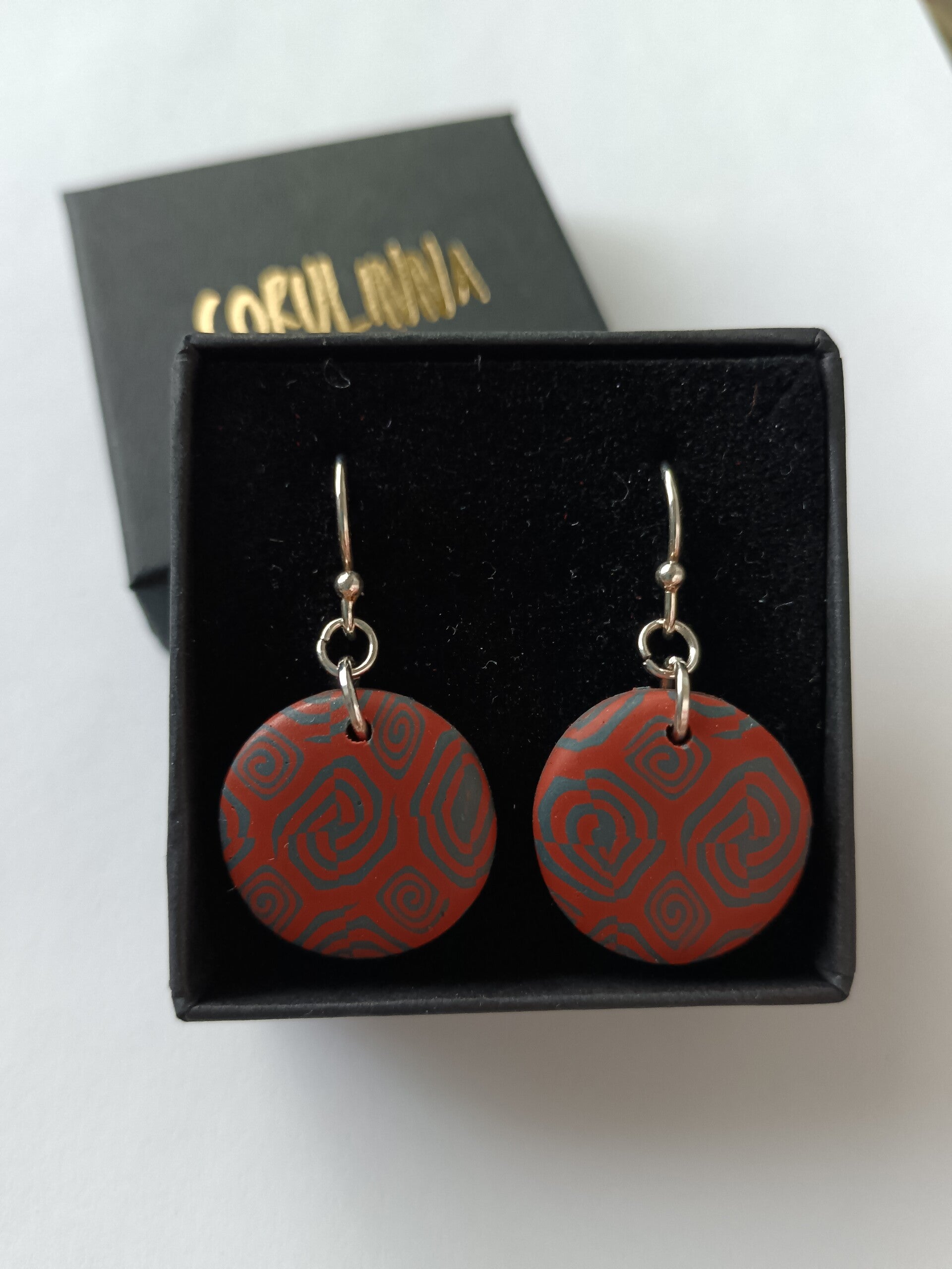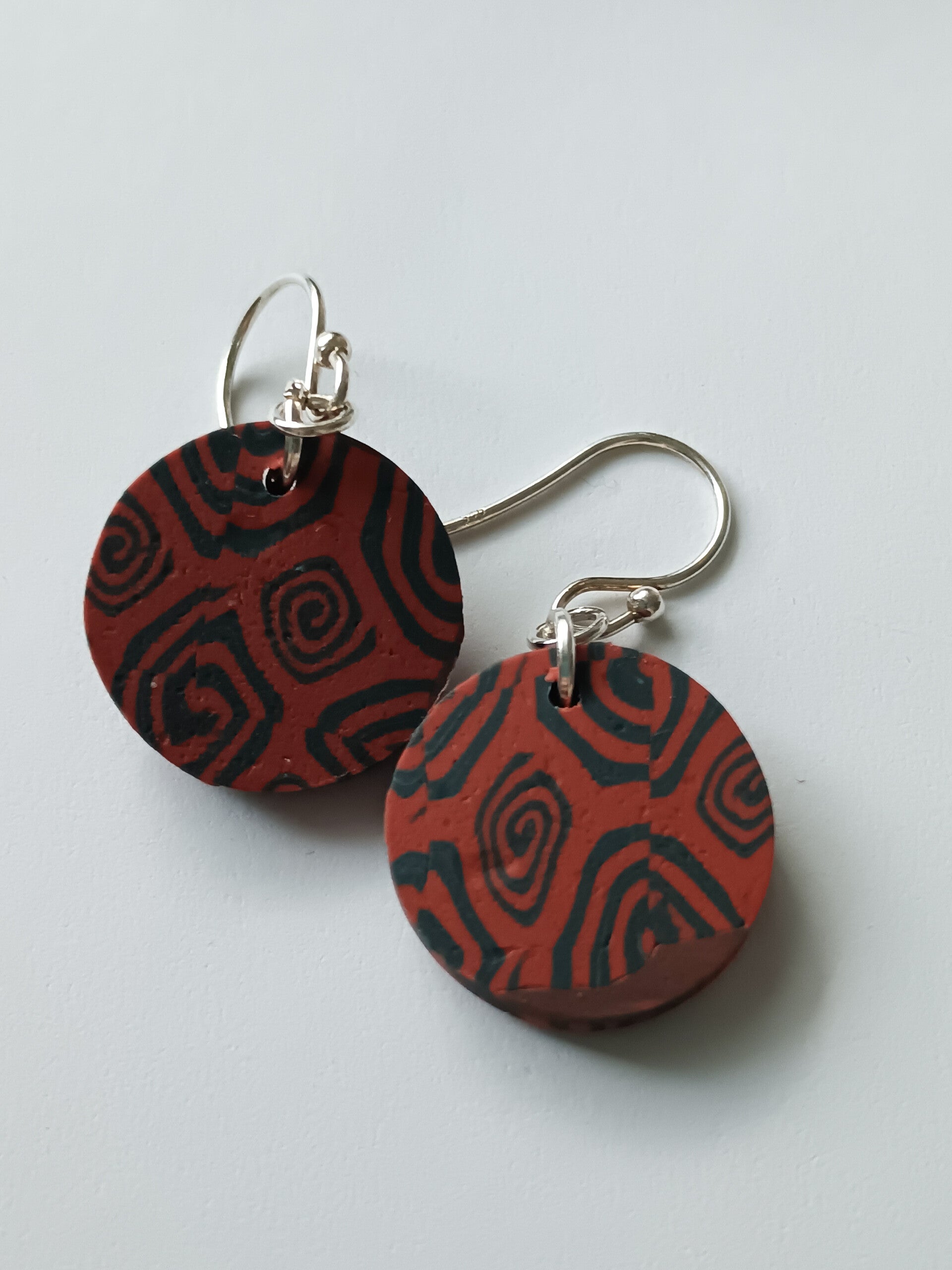 Classic terracotta with grey small circle earrings in geometric swirl pattern finished with stainless steel hooks.