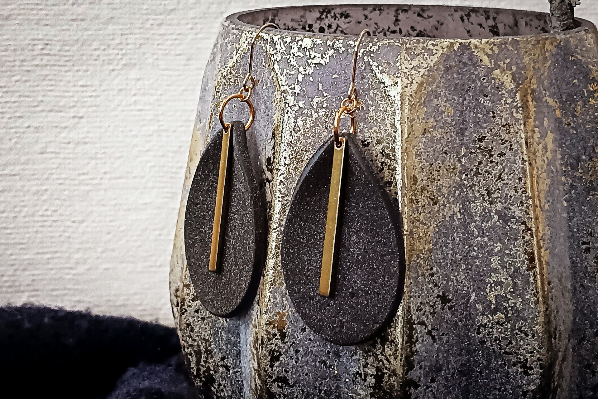 The clay surface is built up with glass inclusions, creating a deep, granular texture that catches light softly, like weathered metal. Finished with simple brass details that add warmth without overpowering the form. Gold plated stainless steel hooks.