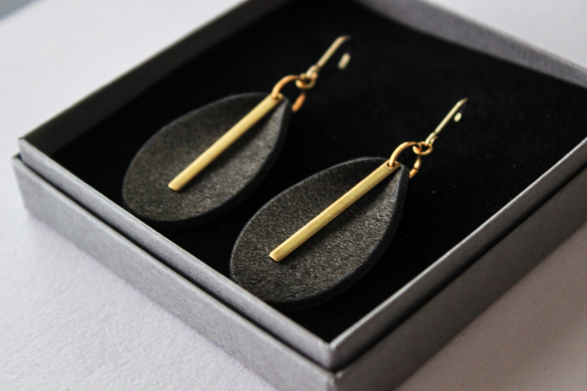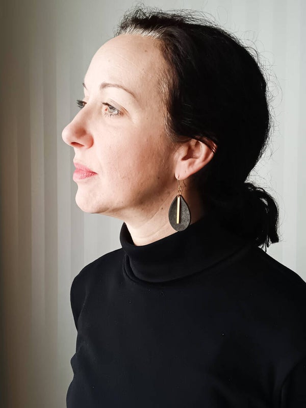 These large tear drop dangle earrings explore contrast: rough and refined, matte and metallic.