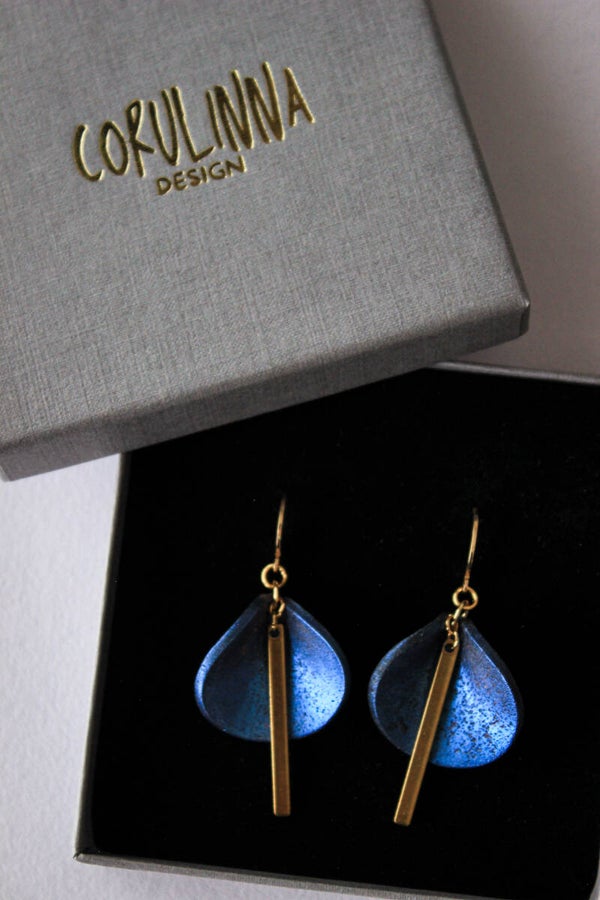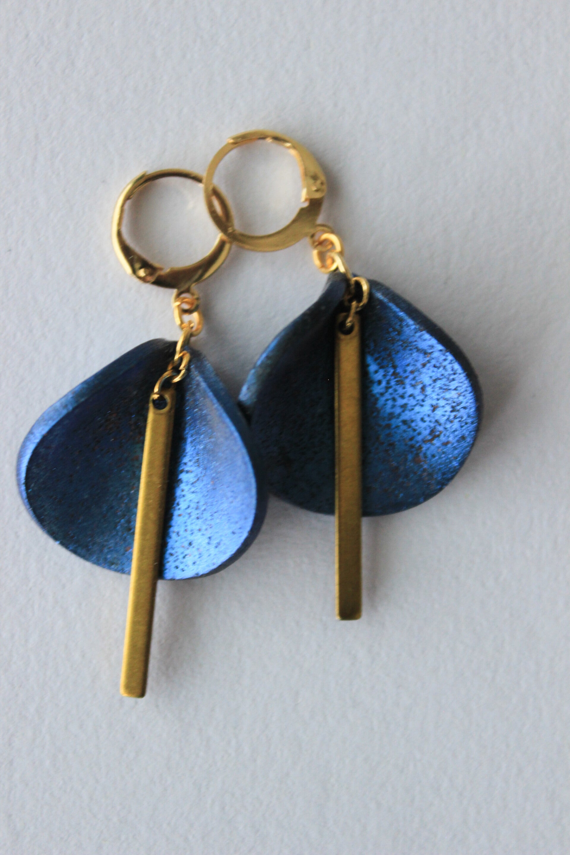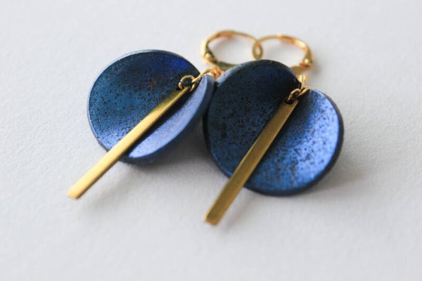Hand-formed polymer clay elements are finished with mica and subtle glass inclusions, creating a deep blue surface with shifting metallic depth. Each curved form is paired with a clean brass bar, introducing a sharp linear interruption to the organic shape.