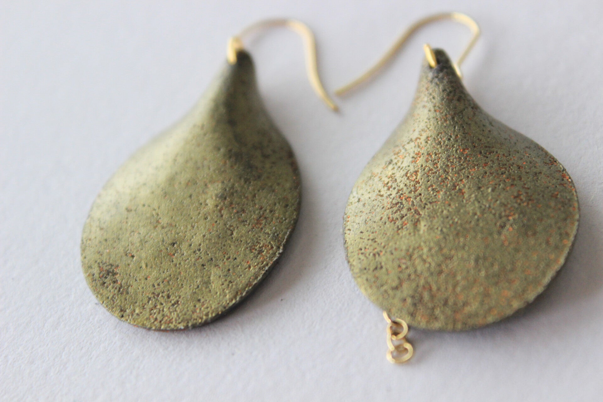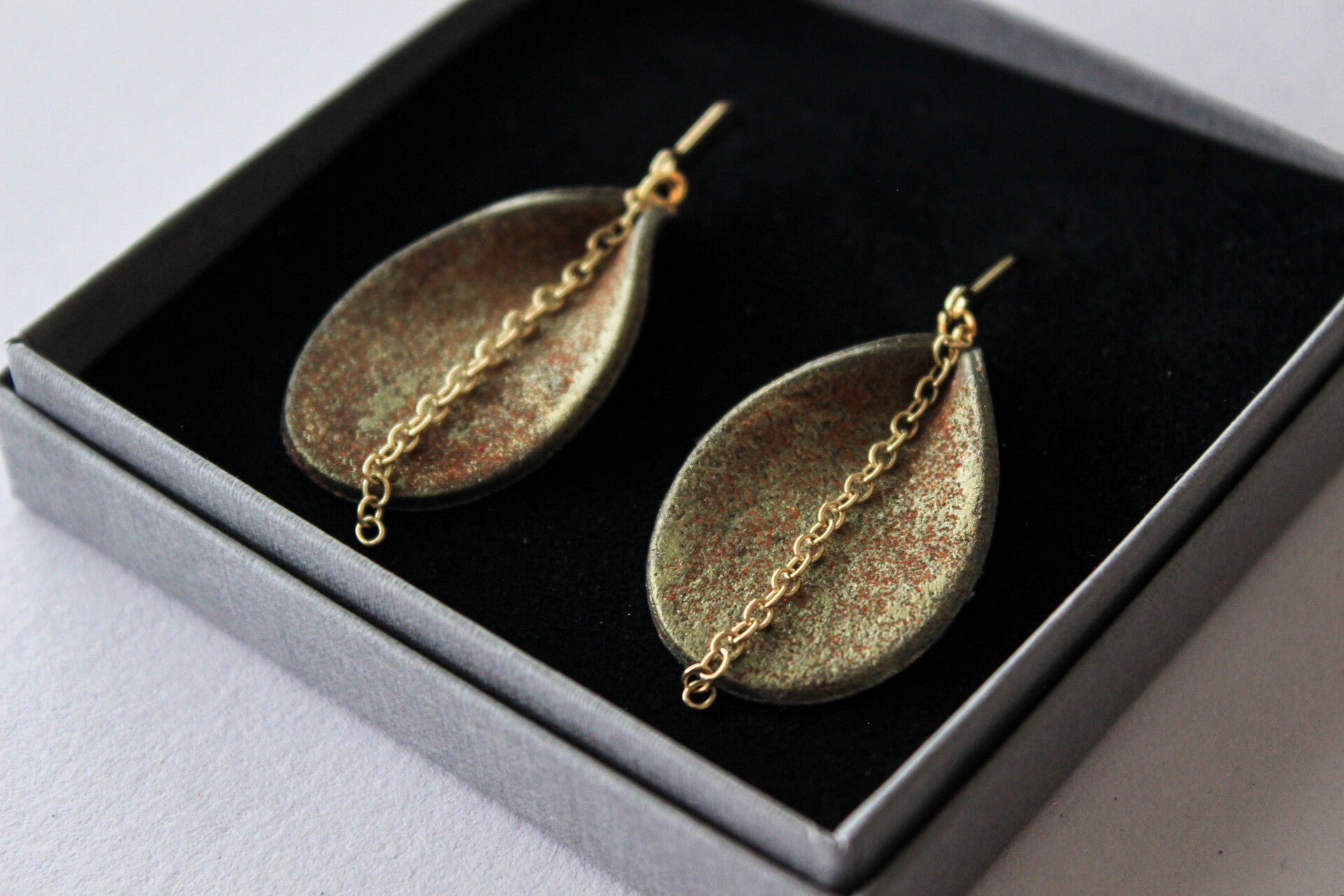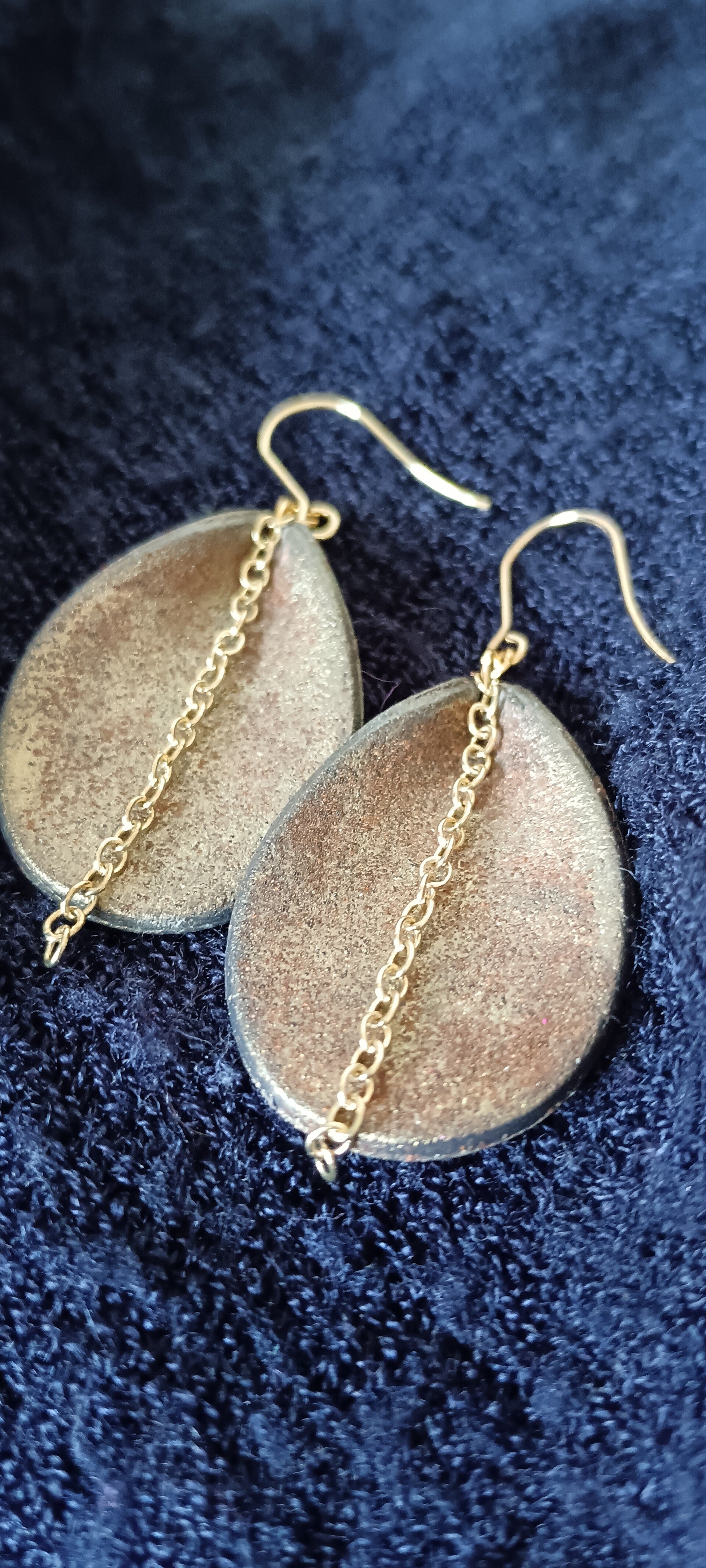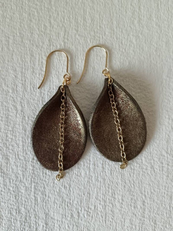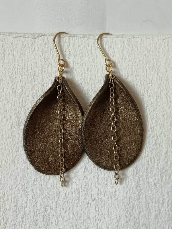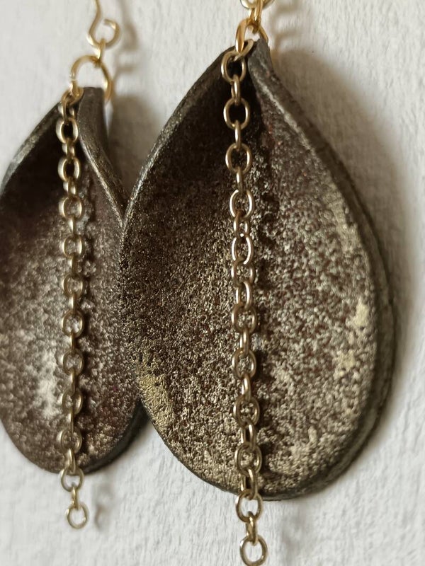 Large tear drop earrings with a brass chain.