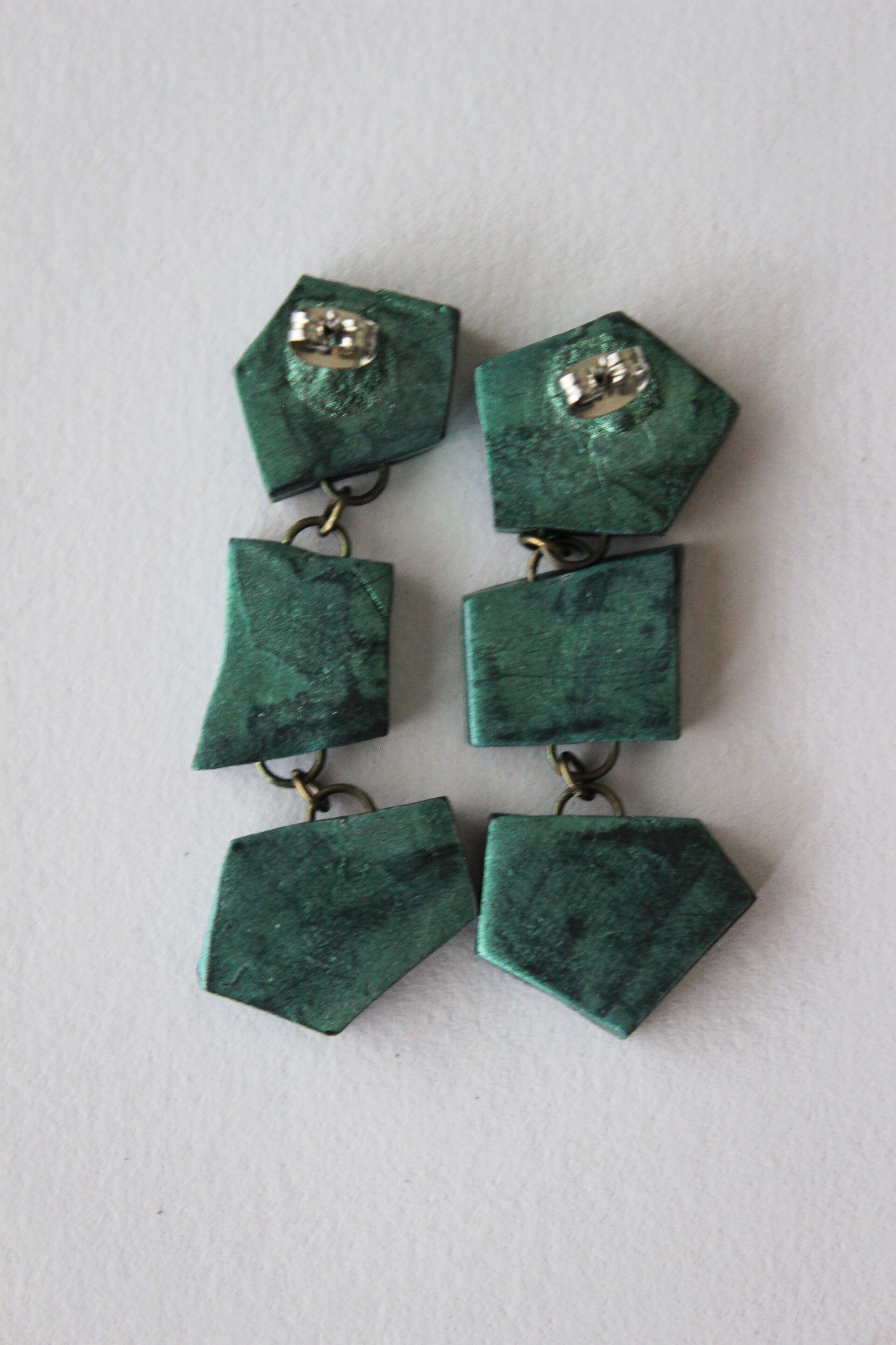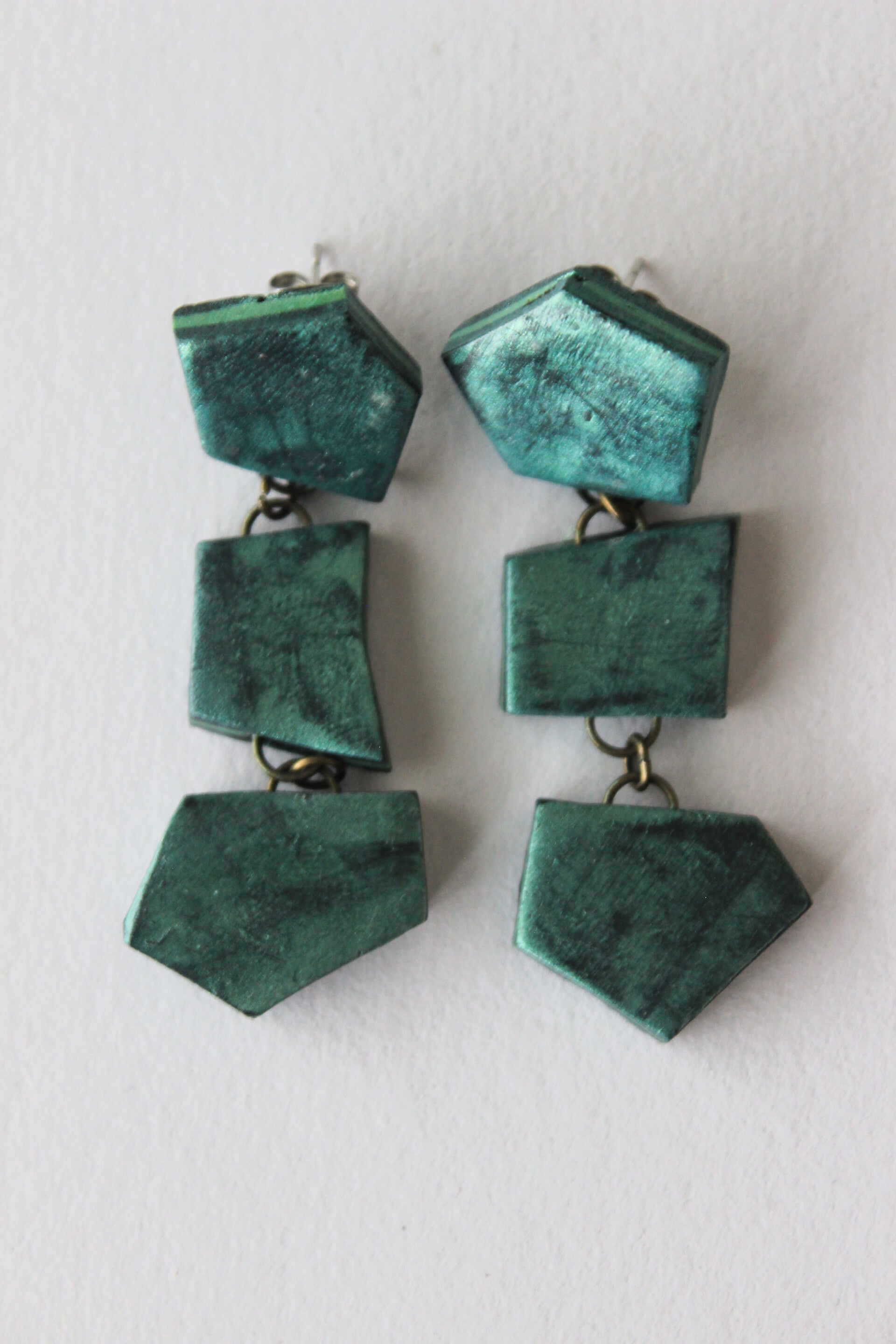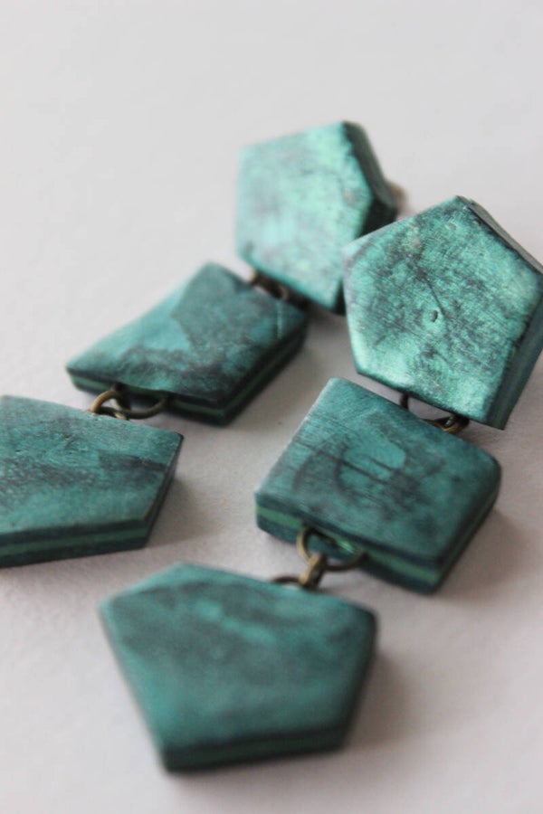 Geometric earrings formed from polymer clay and mica powders, finished with a varnish over deliberately sanded surface to create a weathered, matte texture. The sanding exposes subtle variations in colour and depth, giving each piece a worn, architectural feel.