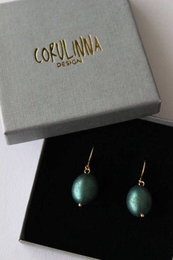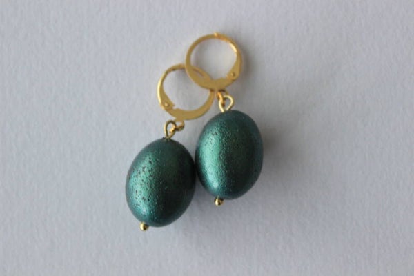 Made from polymer clay, mica powders, glass inclussions and finished with gold plated stainless steel huggie-style hoops.