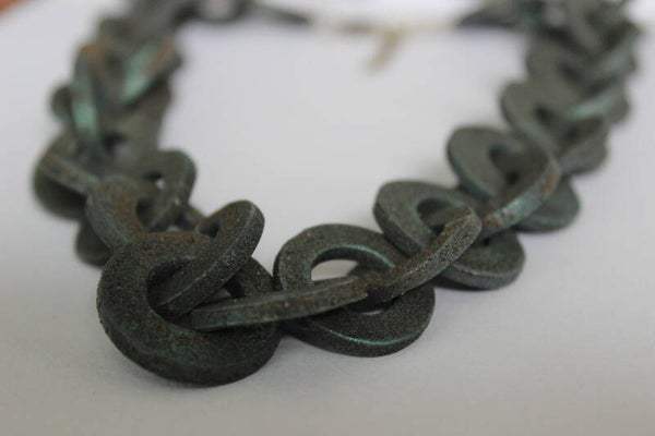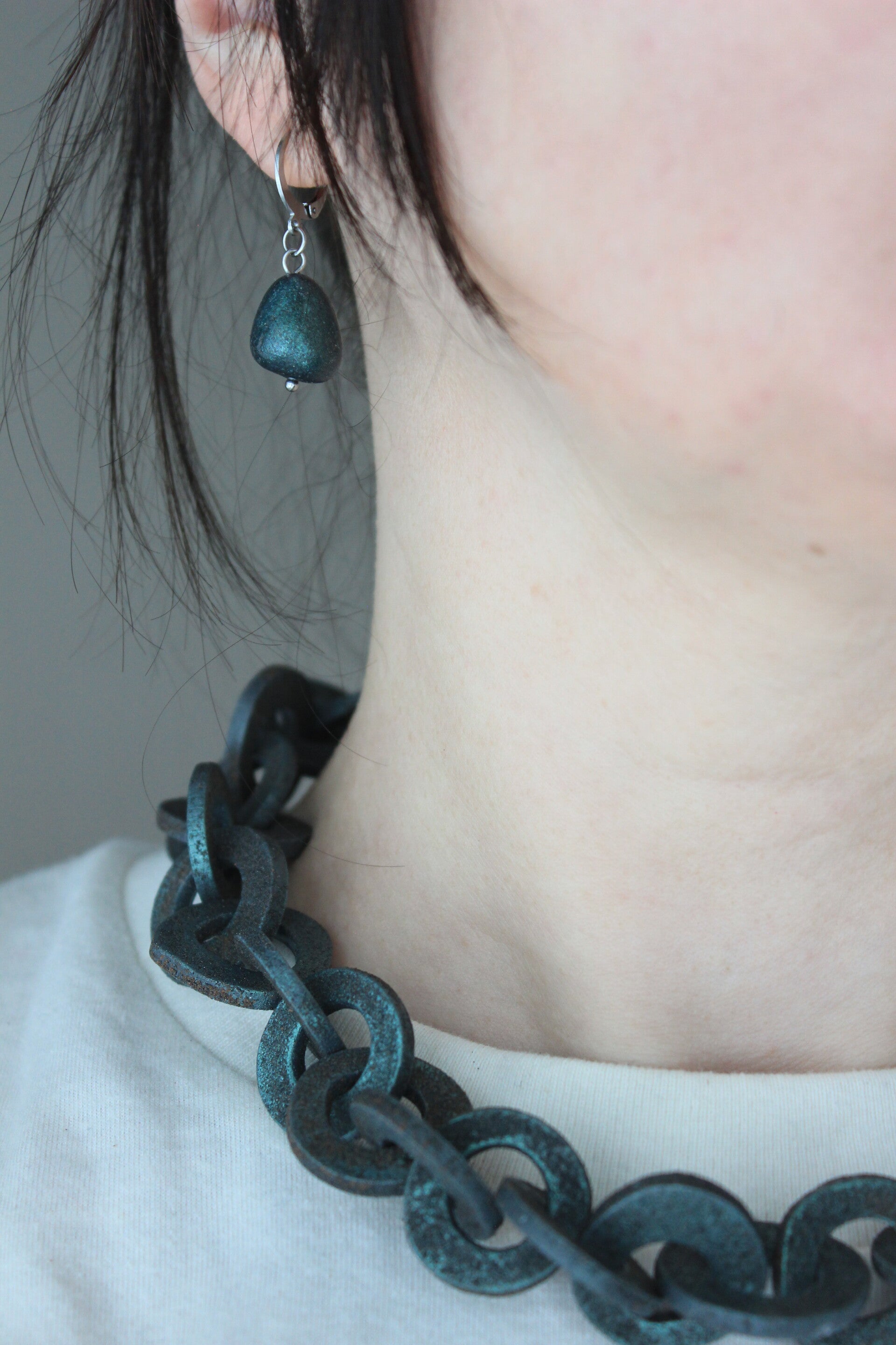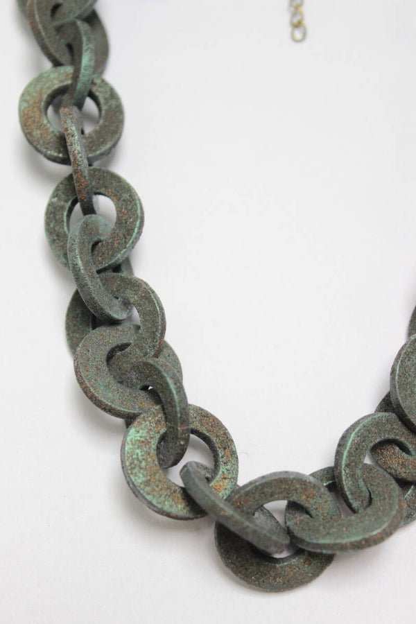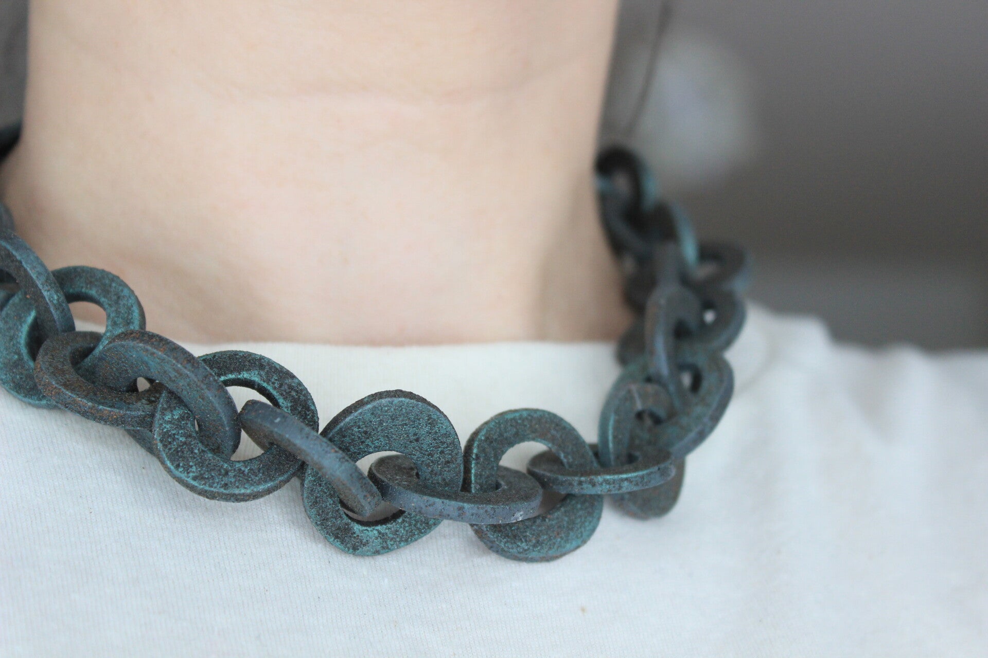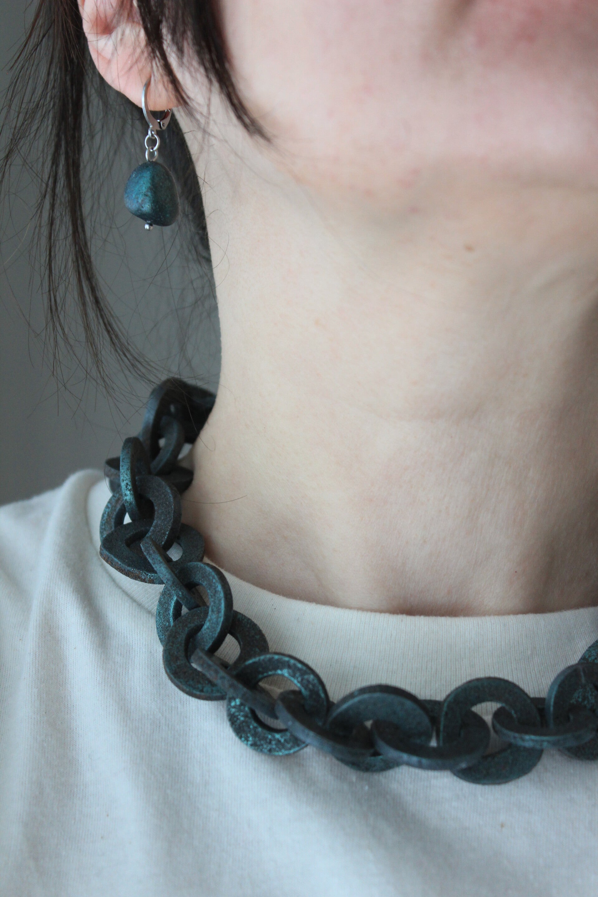 This choker is built from hand-shaped polymer clay elements, worked to resemble something worn and weathered. Glass inclusions and raw pigment powders create uneven, tactile surfaces — nothing fully smooth, nothing identical.