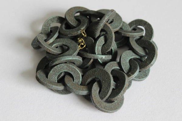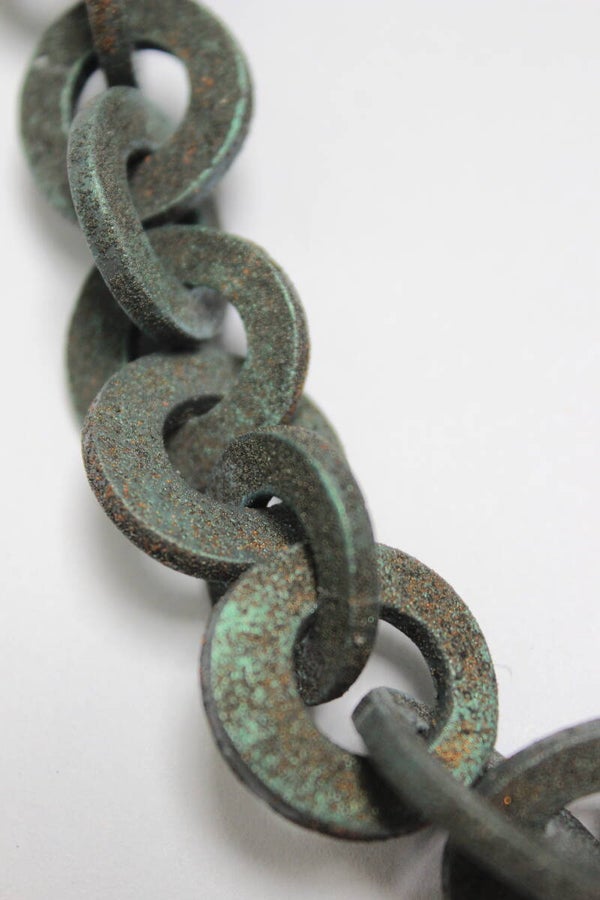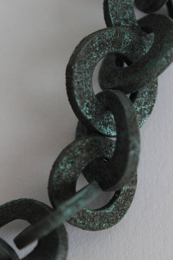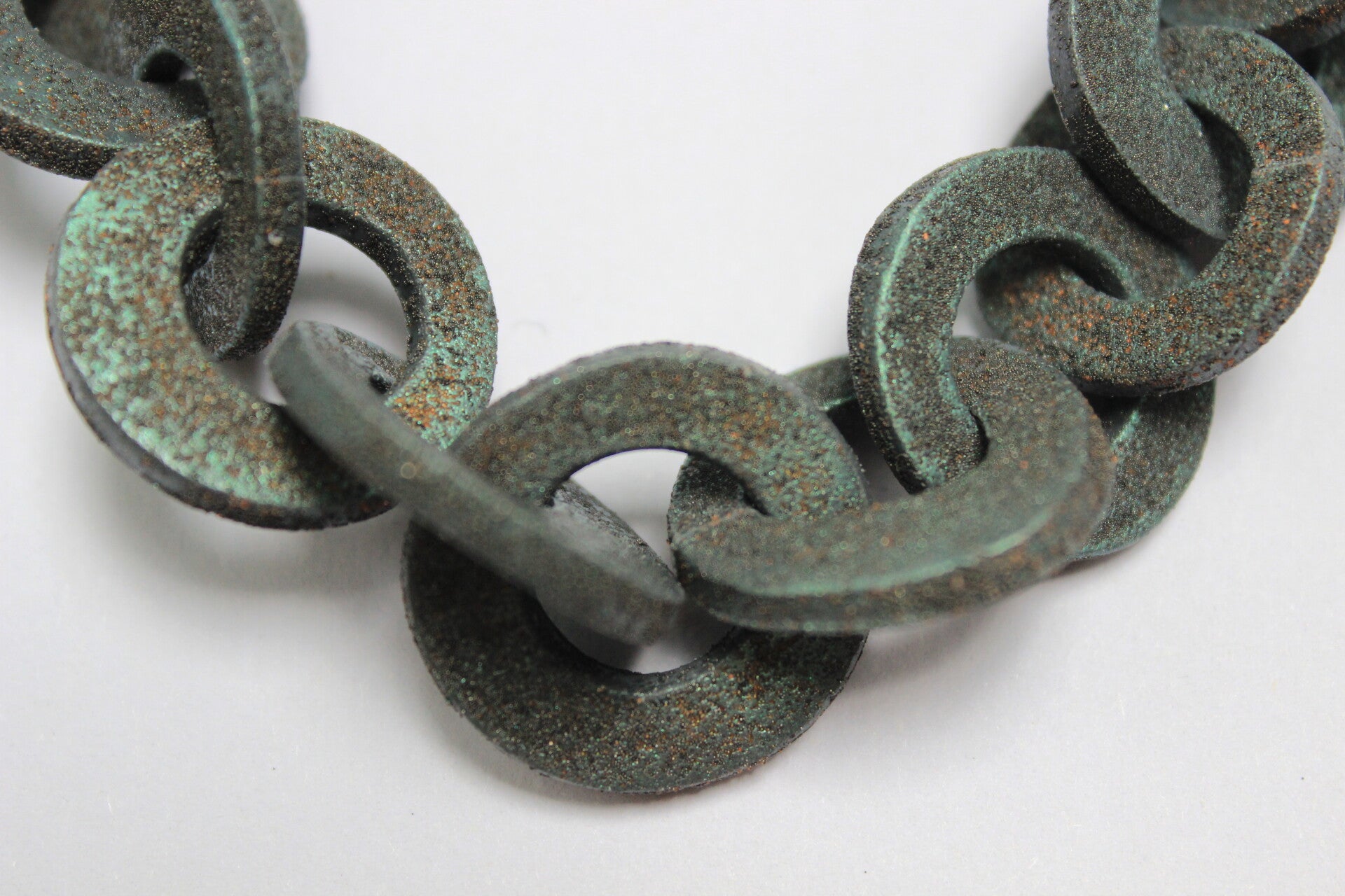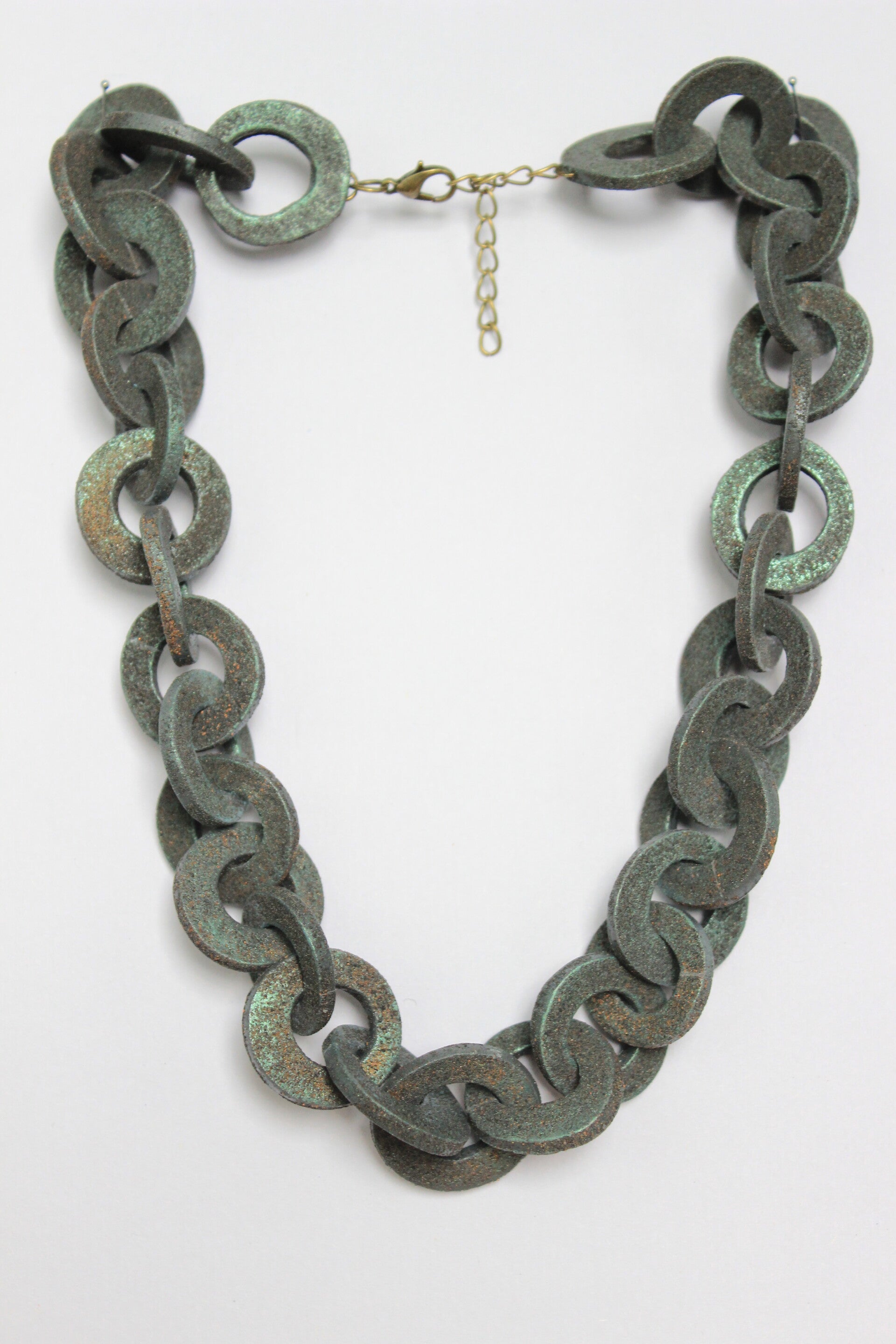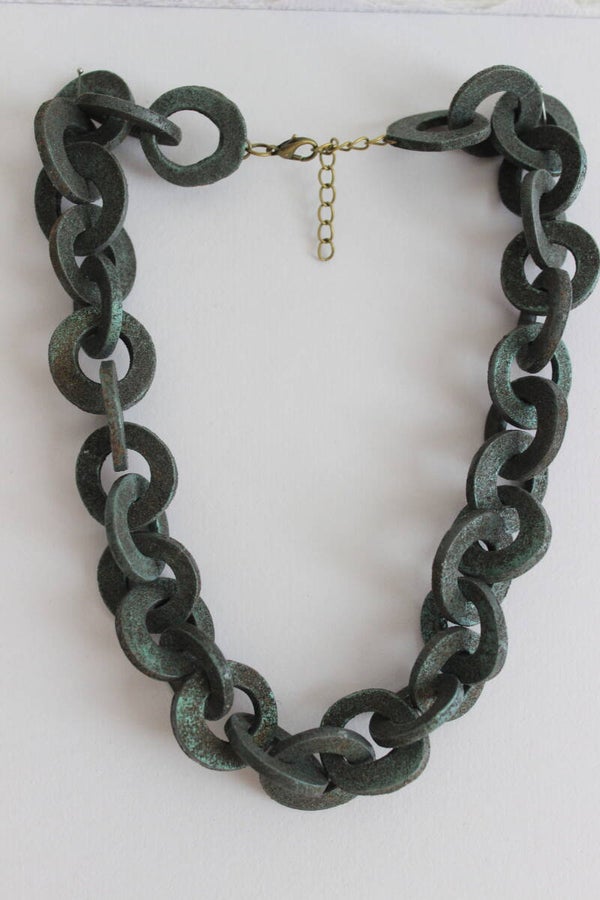 This choker is built from hand-shaped polymer clay elements, worked to resemble something worn and weathered. Glass inclusions and raw pigment powders create uneven, tactile surfaces — nothing fully smooth, nothing identical.